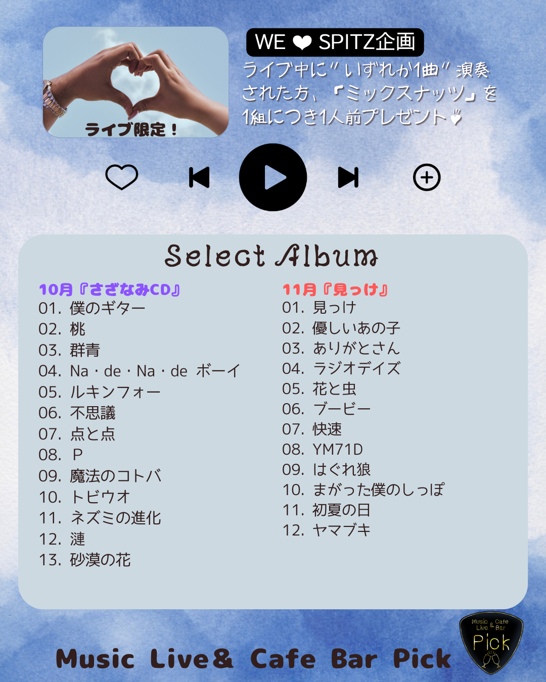 スピッツのアルバム毎に、毎月変わる課題曲を演奏された方、”1組につき1人前分”のミックスナッツをプレゼントしております♪(1回のライブにつき1点まで)